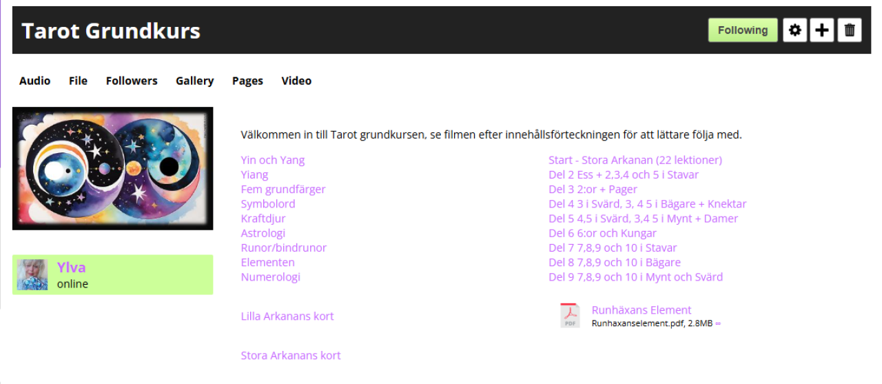 OBSERVERA i kursen ingår material till ALLA sorters Tarotlekar samt texter, ljudfiler, se filmer om alla korten, betydelsen till färg, numerologi, astrologi, runor samt när du lägger Elementhjulets tolkning till alla fem positioner till alla korten. Du läser kursen själv på distans där du finner filmer för alla korten men även filmer för varje del, frågor och svar.